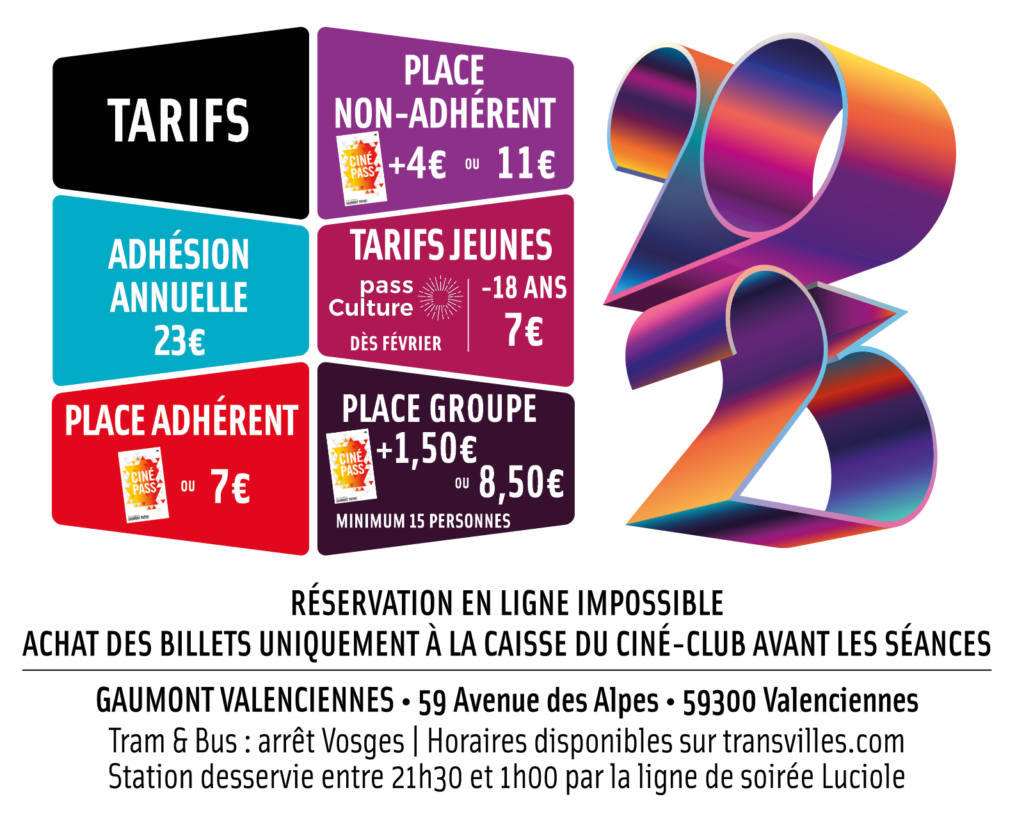 Réservation en ligne impossible sur le site internet du Pathé Valenciennes sauf pour nos séances spéciales (avant-première avec équipe). Ne pas tenir compte de la mention « COMPLET » pour les séances du Ciné-Club.